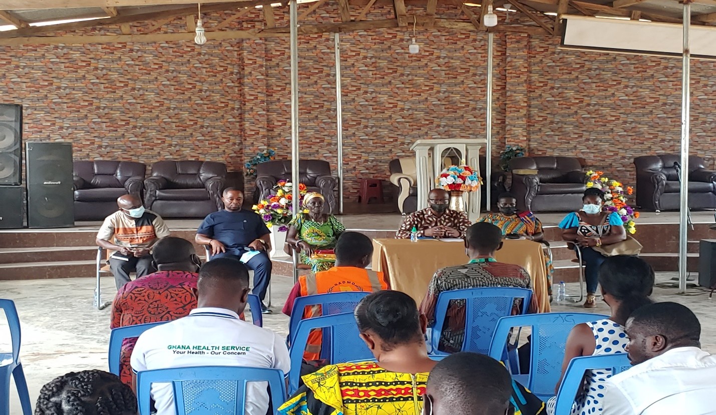 Letters were thus written and sent to stakeholders such as the District Assembly, religious bodies, opinion leaders, traditional council, Security Services, Ghana Education Service, NCCE, GPRTU and etc Letters were also sent to members of the risk communication team in the district. The risk communication team in the district is a well-established team to respond to immediate health related issues in the district. The District Disease Control Officer, Mr Charles Bonney Ghartey, on behalf of the District Director of Health Service for Mpohor gave the welcoming address and did introduction per the dignitaries invited, and further introduced the chairman for the event. He gave a deep on speech on the purpose of the gathering (NIDs) and updated the invited quest and people present at the launch about the current vaccination trends and as well as new updates with regards to Covid-19 vaccination .He stressed emphatically on the need to further wear nose mask and keep observing all safety protocols of covid-19 disease even after vaccination.